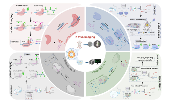 生物影像技术通过可视化解析生物分子、细胞和组织的时空动态,从而获得关于基因调控、疾病机制和药物代谢的重要见解。基于 CRISPR/Cas 的荧光探针将 CRISPR 从“遗传剪刀”转变为“分子显微镜”,成为活体系统中分子事件原位解码的必不可少工具。其高核酸特异性使 CRISPR/Cas 成为动态监测活细胞和体内基因组和转录组事件的关键技术。本研究系统地概述了主流 CRISPR/Cas 荧光探针用于生物成像的设计策略和功能机制,涵盖五大类:荧光蛋白、合成染料、智能门控探针、纳米材料和多模态集成探针。全面分析了实现高灵敏度靶向成像、有效信号放大和精确传递控制的最新进展与持续挑战,包括其在复杂生物环境中的优势、局限性及适应性分析。基于体内递送系统的突破,多样化的载体展现出显著潜力,能够提升 CRISPR/Cas 的运输效率、改善组织穿透性,并实现时空可控释放。持续的创新推动 CRISPR/Cas 成像平台朝着更高的灵敏度、增强的生物相容性和多功能集成性发展,从而促进基因编辑与分子诊断的融合与广泛应用。