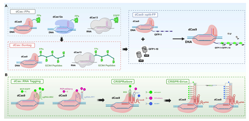 基于FPs的成像策略由CRISPR/Cas系统实现。该图展示了两种将FPs整合到基于CRISPR的生物成像平台中的主要策略,突出它们的作用机制和标记方案。(A) Cas蛋白直接融合FP:荧光蛋白直接与催化失活的dCas变体融合,以实现对特定DNA或RNA靶标的可视化。这包括单个FP融合以及增强系统如SunTag,其中多个GCN4肽招募多个FP以增强信号。另一种方法是分裂FP策略,其中dCas9与GFP11片段融合,并通过单独表达的GFP1-10域进行互补,从而在靶基因位点有条件地组装完整荧光信号。(B) 通过sgRNA支架进行FP标记:该策略利用包含RNA适体环的工程化sgRNA,招募FP偶联的RNA结合蛋白。CRISPRainbow系统采用此方法,通过在单个sgRNA支架中组合不同的适体-蛋白对,实现基因组位点的多色标记。在此基础上,CRISPR-Sirius系统在sgRNA中引入多个串联的适体副本(MS2/PP7),通过在靶位点招募更多FP标记蛋白来增强荧光强度。综合来看,这些系统使得利用单个dCas9蛋白可以实现多重化、动态且高信号的染色质结构成像。FPs:荧光蛋白;sgRNA:单导RNA。