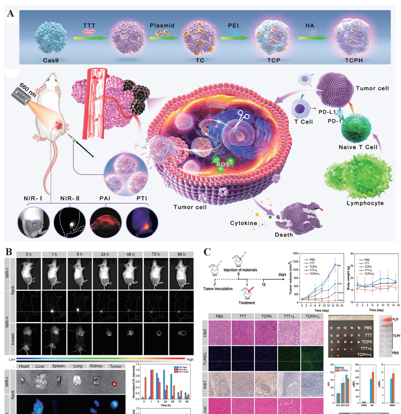 多模态探针。(A) 使用分步组装策略构建TCPH纳米颗粒(NPs)的示意图。(B) 4T1肿瘤负荷的BALB/c小鼠在肿瘤内注射TCPH后不同时间点的体内和离体近红外I/近红外II荧光成像(FLI),显示肿瘤和主要器官。同时展示了肿瘤和器官相应的归一化光致发光(PL)强度。(C) 在单侧皮下4T1肿瘤模型中评估TCPH的抗肿瘤效果,包括体内PDT/PTT/免疫治疗过程、肿瘤生长和体重监测、肿瘤和主要器官的组织学分析(H&E、TUNEL、Ki67)、肿瘤切除、溶血测试、肝肾功能测定以及代表性的西方印迹(WB)图谱。经许可改编自[10],版权2024年归美国化学学会所有。