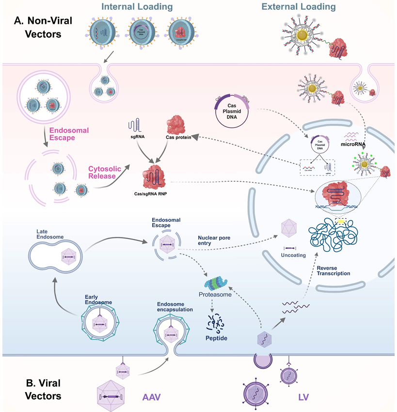 在体内递送CRISPR/Cas系统时,通常使用病毒载体和非病毒载体,两者各有不同的机制和应用优势。在病毒载体(B)中,AAV和LV是使用最广泛的。它们都能结合靶细胞表面的特定受体以启动感染,并随后被内吞。进入细胞后,AAV能够从内体中逃逸并穿过核膜进入细胞核,尽管在细胞质中也可能发生蛋白酶体介导的衣壳降解。相比之下,慢病毒直接与细胞膜融合,将其RNA基因组释放到细胞质中,在那里进行反转录生成双链互补DNA,然后整合到宿主基因组中,从而实现Cas系统的长期表达。与病毒载体相比,非病毒递送系统提供了更高的生物安全性和更大的货物形式多样性,包括质粒DNA、mRNA和预组装的RNPs(A)。这些系统可以设计为内部或外部装载货物。通常,非病毒载体通过内吞进入细胞,并必须从内体中逃逸,将货物释放到细胞质中。根据递送的形式,质粒DNA需要达到细胞核进行转录,mRNA在细胞质中被翻译生成Cas蛋白,而RNPs可以直接转运进入细胞核以靶向特定DNA序列。AAV:腺相关病毒;CRISPR:成簇规律间隔短回文重复序列;Cas:CRISPR相关蛋白;RNP:核糖核蛋白复合物;LV:慢病毒。