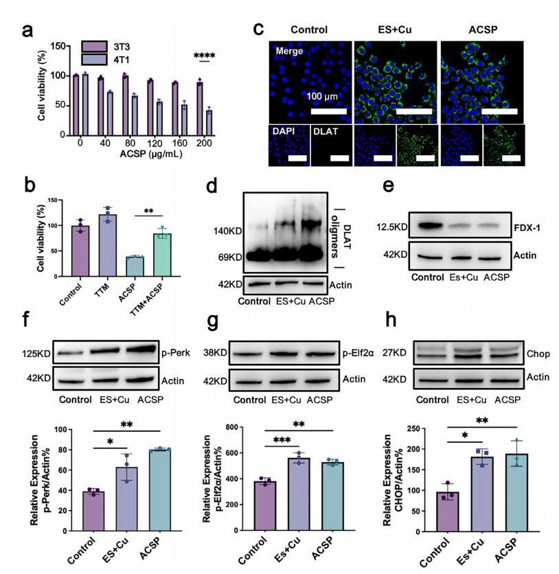 ACSP 纳米颗粒治疗效果的体外评估。(a)不同浓度 ACSP 纳米颗粒处理下4T1细胞与3T3细胞的相对存活率,n=3。(b)4T1细胞分别暴露于 TTM 、 ACSP 纳米颗粒及 TTM + ACSP 纳米颗粒后的相对存活率,n=3。(c)经PBS、ES+Cu和 ACSP 处理后4T1细胞 DLAT 染色的荧光图像。(d)通过蛋白质印迹法检测不同处理组4T1细胞内 DLAT 寡聚蛋白的表达。(e)通过蛋白质印迹法检测不同处理组4T1细胞内FDX1蛋白的表达。细胞内(f)p-Perk、(g)p- Elf2α 及(h)Chop蛋白在不同处理组4T1细胞中的表达及定量分析,n=3。数据以均值±标准差表示。(b,f−h)组采用单因素方差分析结合Tukey事后检验计算统计学显著性。*p<0.05,**p<0.005,***p<0.001。