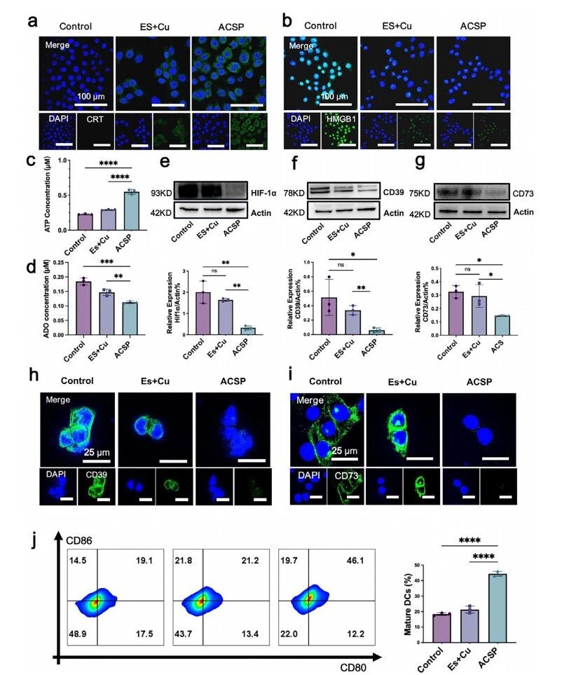 体外 ACSP 中NCs介导的免疫原性细胞死亡与CD39/CD73调控。(a)不同处理条件下4T1细胞的CRT及(b)HMGB1荧光图像。(c)不同处理条件下的ATP浓度与(d)ADO浓度,n=3。通过蛋白质印迹法检测不同处理条件下4T1细胞内(e)HIF- 1α 、(f)CD39及(g)CD73蛋白的表达及定量分析,n=3。(h)不同处理条件下4T1细胞的CD39及(i)CD73荧光图像。(j)流式细胞术数据及定量分析显示不同处理条件下4T1细胞的树突状细胞成熟度(CD80+CD86+),n=3。数据以均值±标准差表示。(c–g,j)组采用单因素方差分析结合Tukey事后检验计算统计学显著性。*p<0.05,**p<0.005,***p<0.001,****p<0.0001,ns表示无显著性差异。