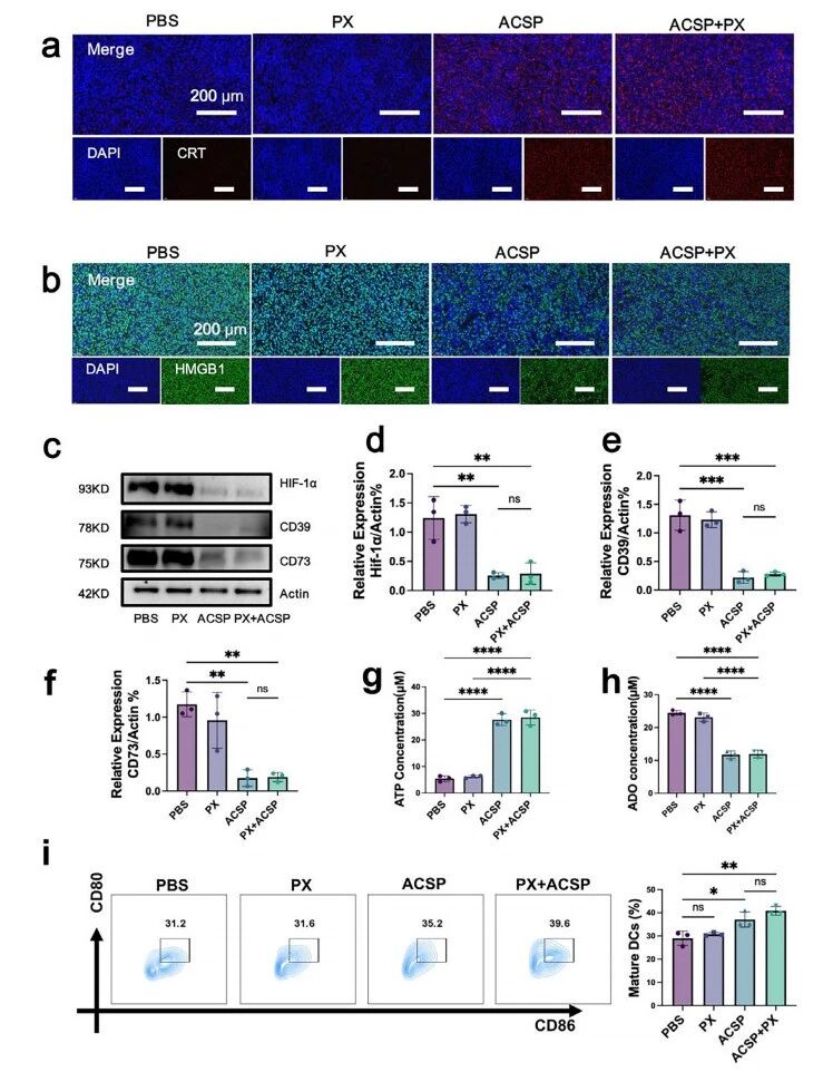体内 ACSP 中神经胶质细胞(NCs)介导的 ICD 与CD39/CD73调控。(a)不同处理组肿瘤的CRT及(b)HMGB1荧光图像。(c)通过蛋白质印迹法检测不同处理组肿瘤中CD73、CD39及HIF- 1α 蛋白的表达。(d)HIF- 1α 、(e)CD39和(f)CD73蛋白在不同处理组体内的定量分析(n=3)。(g)不同处理组ATP浓度,(h)不同处理组ADO浓度(n=3)。(i)流式细胞术数据及定量分析显示不同处理组肿瘤中树突状细胞(DC)成熟度(CD80+CD86+)(n=3),数据以均值±标准差表示。(d–i)组统计学显著性采用单因素方差分析及Tukey事后检验计算。*p<0.05,**p<0.005,***p<0.001,****p<0.0001,ns表示无统计学意义。