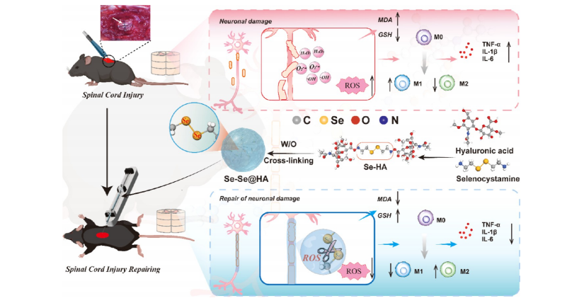 这篇研究开发了一种基于二硒键的交联纳米酶Se-Se@HA,用于促进脊髓损伤修复。通过清除过量的活性氧并调节免疫微环境,该纳米凝胶能抑制M1型巨噬细胞极化、提升M2型表现,降低TNF-α、IL-1β和IL-6等促炎因子水平。体外实验表明,Se-Se@HA能有效保护神经元免受氧化损伤,促进轴突生长与连接;在动物模型中,它显著提升运动功能评分、步态协调性,增强运动诱发电位与肌电信号,减少肌肉萎缩,并促进损伤区轴突连续性与突触信号恢复。转录组分析进一步显示,该治疗下调了NF-κB、TNF和MAPK等炎症通路,同时增强了与突触传递和神经再生相关的基因表达。这些结果证实,Se-Se@HA作为一种多功能纳米酶平台,能协同缓解氧化应激、恢复免疫平衡并促进神经再生,为脊髓损伤治疗提供了具有潜力的新策略。