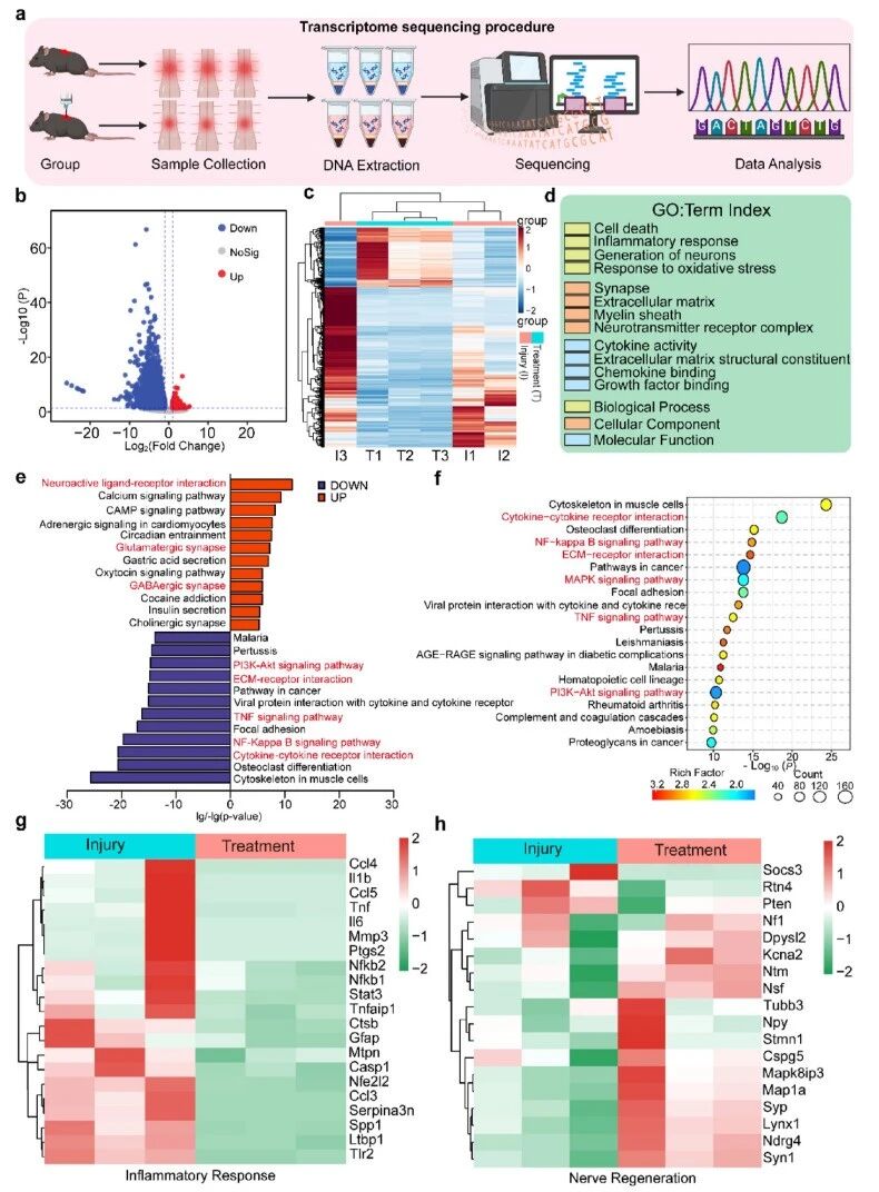 Se−Se@HA体内神经保护作用的转录组学研究。(a) 用于阐明Se−Se@HA在脊髓损伤修复中神经保护机制的体内转录组测序与生物信息学分析流程示意图。(b) 火山图显示损伤组与治疗组之间的差异表达基因(DEGs)。