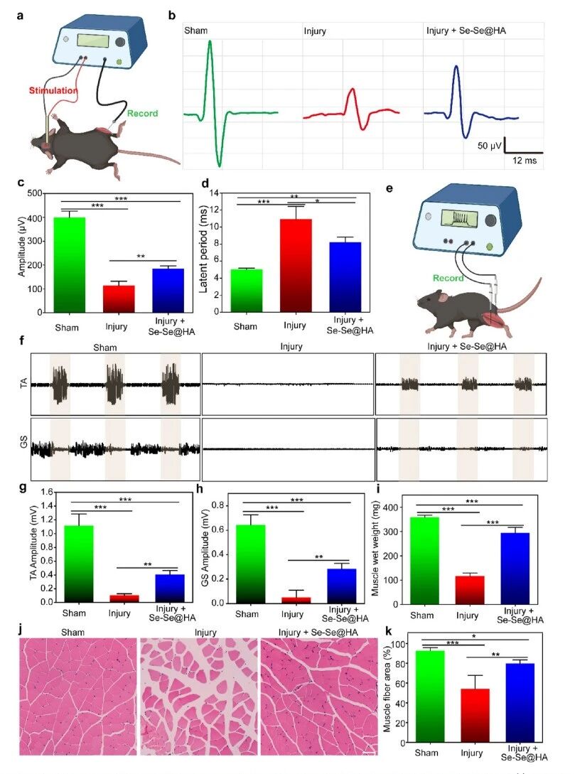 Se−Se@HA促进脊髓损伤(SCI)小鼠电生理功能恢复及预防肌肉萎缩的能力。(a) 运动诱发电位(MEP)记录装置示意图,左侧运动皮层刺激,右侧腓肠肌记录。(b) 术后4周假手术组、损伤组及Se−Se@HA处理组小鼠的代表性MEP波形。