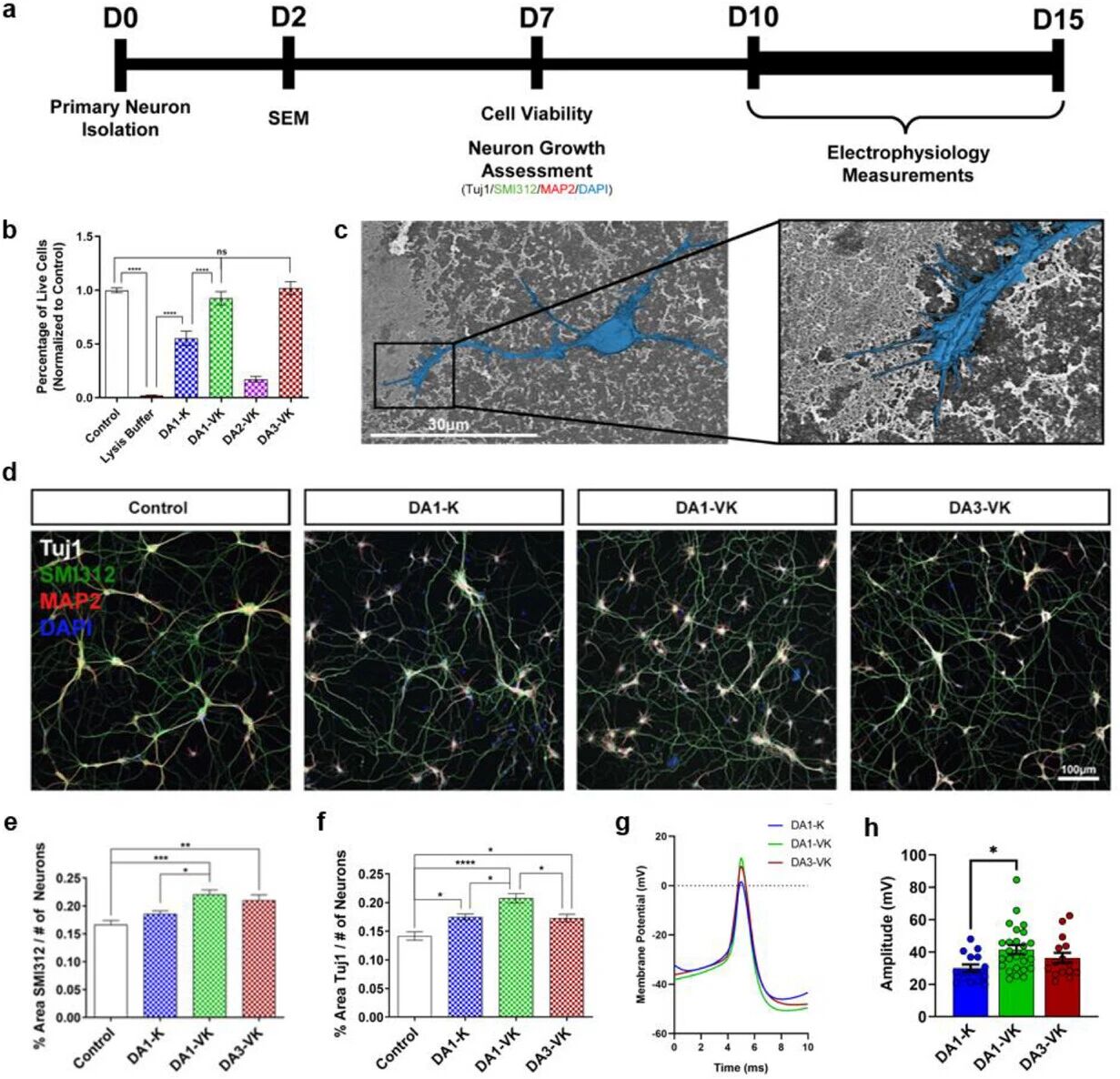 供体-受体肽两亲性纳米结构涂层支持原代皮层神经元存活与生长。a、神经元实验时间线示意图。b、原代神经元在DA-PA材料涂层培养一周后活细胞与总细胞比率(相对于对照组标准化)。活/死细胞可视化结果见图S48。c、在DA3-VK涂层培养48小时的原代神经元(伪彩标注为蓝色)扫描电镜典型显微图像。d、DA-PA涂层培养一周神经元的典型共聚焦图像。原代神经元分别用Tuj1(神经骨架,白色)、MAP2(成熟树突,红色)、SMI312(成熟轴突,绿色)和DAPI(细胞核,蓝色)染色(采用PDL涂层对照)。e、每视野SMI312阳性神经突覆盖面积百分比(经DAPI阳性细胞核数量标准化)定量。f、每视野Tuj1阳性神经突覆盖面积百分比(经DAPI阳性细胞核数量标准化)定量。g、DA-PA涂层培养10-15天神经元的典型动作电位轨迹。h、DA-PA涂层培养10-15天神经元动作电位幅度定量。对于(b、e、f、h)采用单因素方差分析结合Tukey多重比较检验(α=0.05):(*) p < 0.05,(**) p < 0.01,(***) p < 0.001,(****) p < 0.0001。