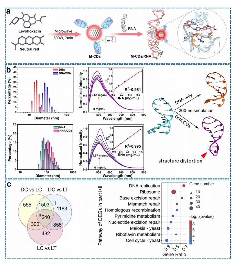 (a) 碘化镉(CDs)可通过氢键和静电相互作用插入RNA发夹结构中。经参考文献[59]授权转载。版权2023年,Wiley- VCH 。(b) 动态光散射(DLS)和荧光光谱证实了CDs与DNA及RNA的结合相互作用。且CDs的存在可导致DNA结构扭曲及末端碱基对错位。经参考文献[60]授权转载。版权2018年,美国化学会。(c) 灰色假单胞菌(B. cinerea)不同处理条件下的RNA测序(RNA-seq)数据。DC:黑暗对照;LC:光照对照;LT:光照+CDs。经参考文献[61]授权转载。版权2025年,Wiley- VCH 。