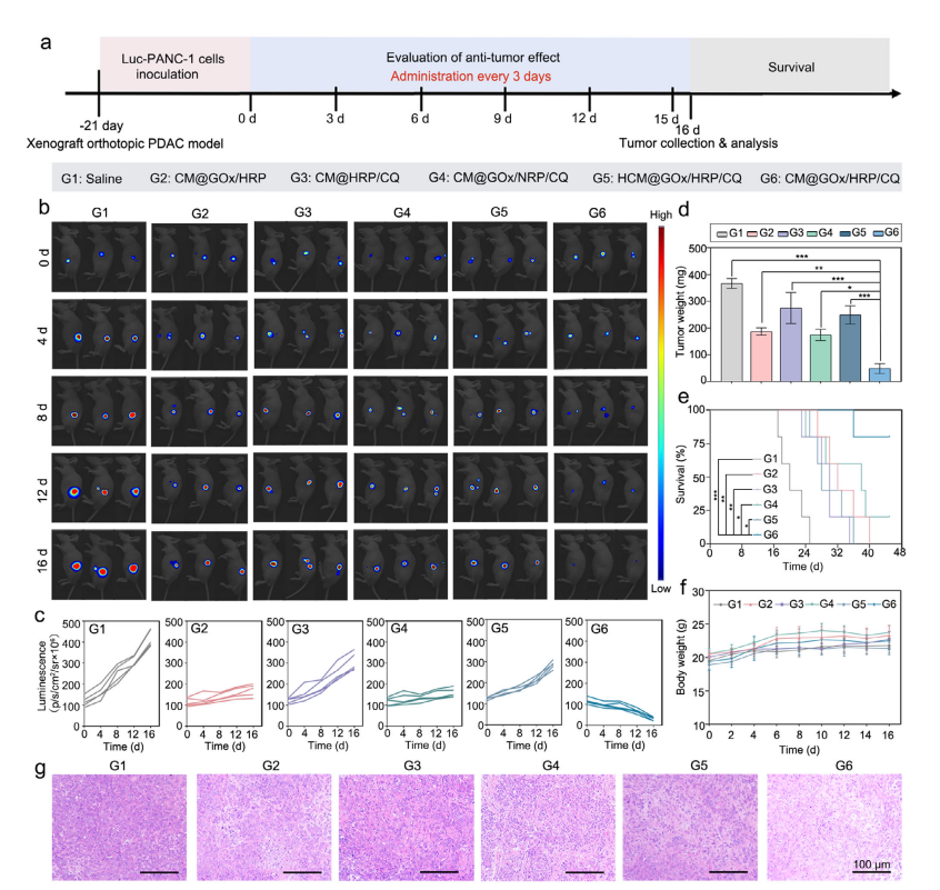 CM@GOx/ HRP /CQ在异种移植原位 PDAC 模型中的体内抗肿瘤效果。a) 异种移植原位 PDAC 模型建立及治疗监测方案示意图。b) 治疗后第0、4、8、12和16天 PDAC 荷瘤小鼠的体内生物发光成像(BLI),可视化不同制剂(包括生理盐水、CM@GOx/ HRP 、CM@ HRP /CQ、CM@GOx/ NRP /CQ、 HCM @GOx/ HRP /CQ和CM@GOx/ HRP /CQ)的肿瘤负荷。c) 胰腺部位生物发光强度的半定量分析随时间变化(n=5)。d) 最终治疗后第16天的肿瘤重量(n=3)。e) PDAC 荷瘤小鼠45天观察期内的Kaplan-Meier生存曲线(n=5)。f) PDAC 荷瘤小鼠在16天给药期间的体重变化(n=5)。g) 治疗结束时采集的肿瘤组织H&E染色结果。比例尺=100 µm 。数据以均值±标准差表示,*p<0.05,**p<0.01,***p<0.001。