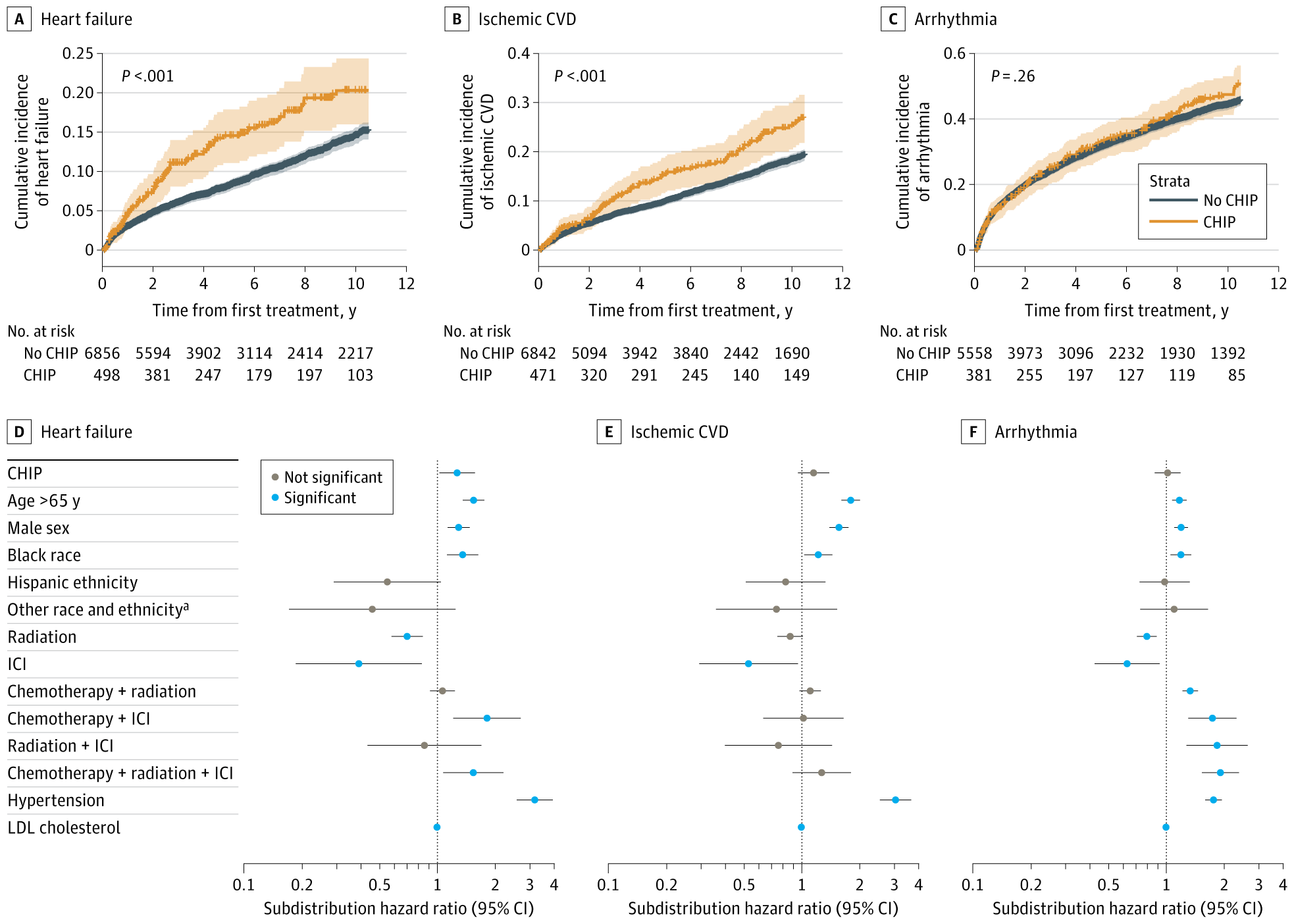 To more accurately assess the relationship between CHIP and cardiovascular events, the study used propensity score matching to balance differences in baseline characteristics, such as age, sex, and underlying conditions, between patients with and without CHIP. The results showed that in the matched cohort, patients with CHIP had a significantly higher cumulative incidence of heart failure within 10 years of treatment (20.3% vs. 14.5%), and the incidence of ischemic cardiovascular disease was also noticeably higher (25.3% vs. 18.5%). In multivariable analyses adjusted for demographic and clinical factors, CHIP remained independently associated with an increased risk of heart failure.