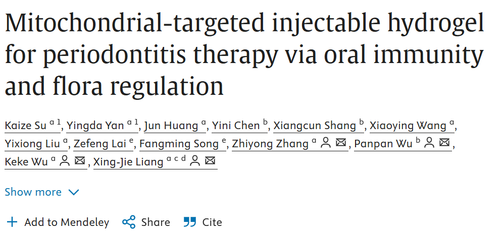 This article was published on December 13, 2025, in Bioactive Materials (Impact Factor 20.3), titled "Mitochondria-Targeted Injectable Hydrogel for Periodontitis Treatment via Oral Immunity and Microbiota Modulation." The study addresses the challenges of antibiotic resistance and microbial imbalance in periodontitis treatment by designing a novel injectable hydrogel platform named GM/OHA-GZN&M. This platform achieves antibiotic-free comprehensive periodontitis therapy by disrupting subgingival biofilms, remodeling the immune microenvironment, and regulating oral microbial balance. In vivo experiments showed that the hydrogel significantly inhibited inflammation and promoted alveolar bone regeneration, providing a new strategy for periodontitis treatment.
