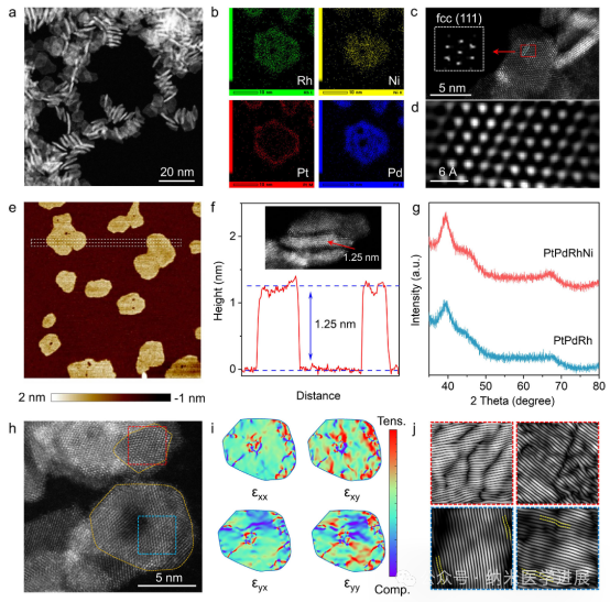 Nanomachines are a new type of antibacterial agent that can eliminate pathogenic threats by catalyzing reactive oxygen species (ROS); however, their ability to combat multi-drug resistant (MDR) infections is still limited by catalytic efficiency, substrate affinity, and instability. In this study, the team reported a new strategy of incorporating Ni into ultrathin PtPdRh nanosheets to construct lattice strain, aiming to enhance substrate affinity and improve the enzyme-like catalytic activity. The PtPdRhNi nanomachine achieved a catalytic efficiency of 2.05 x 10⁷ M⁻¹ s⁻¹ (Kcat/Km), which was 56.5 times higher than PtPdRh, and maintained over 90% activity after 15 months. Theoretical calculations indicated that the incorporation of Ni shifted the d-band center from -1.80 eV to -1.27 eV and strengthened Pt-O bonding, thereby accelerating the activation of H₂O₂ to ·OH. The team further demonstrated that the synergistic treatment of PtPdRhNi with H₂O₂ could achieve 100% eradication of methicillin-resistant Staphylococcus aureus (MRSA) and Escherichia coli, as well as over 99.97% killing of Streptococcus mutans and Porphyromonas gingivalis. In rat periodontal inflammation, MRSA-infected skin wounds, and deep abscess models, this catalytic platform could achieve rapid bacterial clearance, alleviate inflammation, and regenerate collagen-rich tissues. Transcriptomic analysis of MRSA treated with PtPdRhNi and H₂O₂ identified 1048 differentially expressed genes, revealing the closure of the respiratory chain and the tricarboxylic acid (TCA) cycle, and the weakening of antioxidant defense, which led to energy depletion, oxidative damage, and transcriptional reprogramming. This study was published in "Advanced Materials" under the title "Precise Strain Tuning of PtPdRhNi Nanozyme Boosts Multi-Pathogen and Multi-Model Antibacterial Therapy".