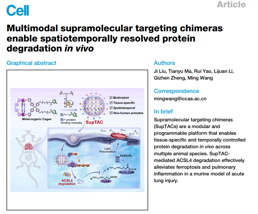 Targeted protein degradation (TPD) has transformed strategies for regulating protein function in basic biology and therapeutic development. However, existing approaches often lack the spatial and temporal precision required for in vivo applications. Here, we report supramolecular targeting chimeras (SupTACs), a modular and programmable platform capable of achieving tissue-specific and temporally controlled protein degradation. SupTACs self-assemble into supramolecular nanoparticles (SNPs) that co-localize target-binding ligands and E3 ligase recruiters, thereby promoting proteasomal degradation through the multivalent proximity of the supramolecules. This strategy achieves robust and tissue-specific degradation across multiple species, including non-human primates, with specificity in the liver and lungs. As a proof of concept, using SupTACs to specifically degrade acyl-CoA synthetase long-chain family member 4 (ACSL4) effectively alleviates ferroptosis and lung inflammation in a mouse model of acute lung injury. By integrating modularity, tissue specificity, and temporal control, SupTACs establish a versatile platform for precise protein degradation, enabling the exploration of dynamic signaling networks and the development of targeted therapeutics.
