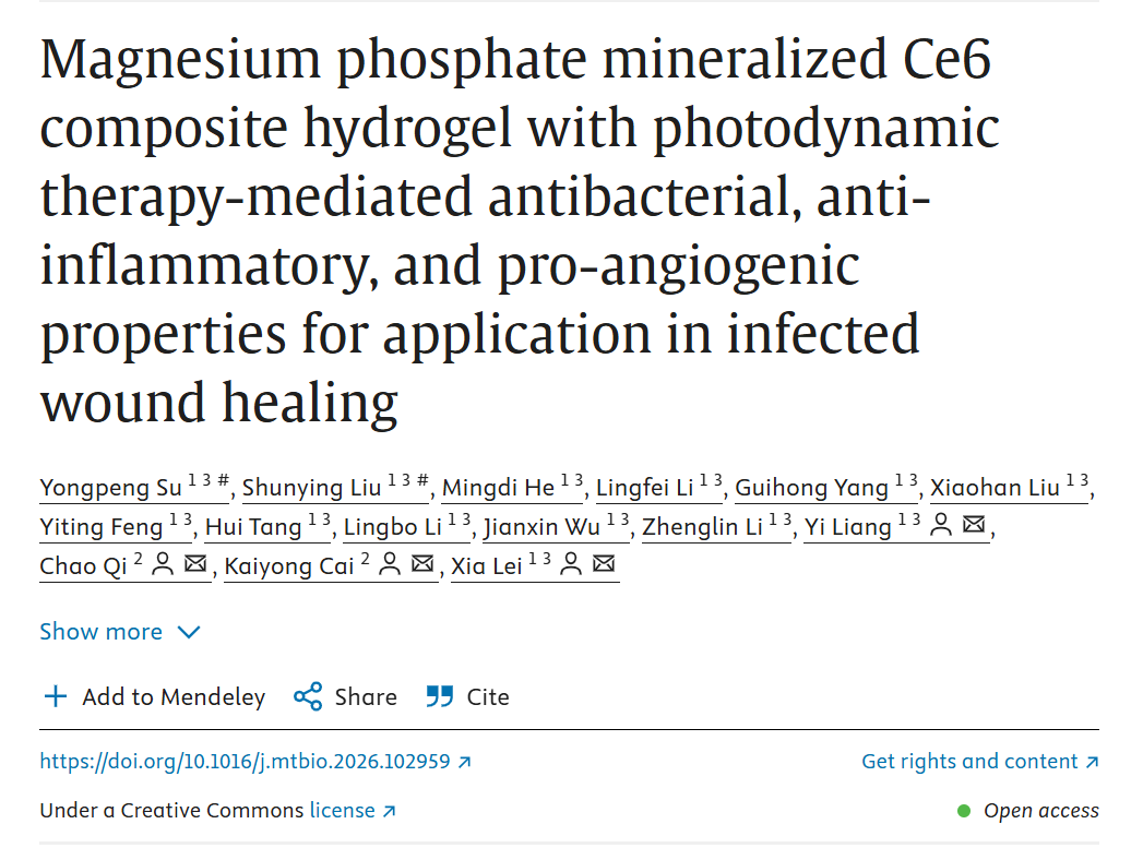 This study investigated a novel composite hydrogel dressing for the efficient healing of infected wounds. To address challenges such as antibiotic resistance and the easy deactivation and poor retention of photosensitizers in traditional photodynamic therapy (PDT), the researchers developed a biomimetic mineralization strategy. This strategy encapsulates the small molecule photosensitizer chlorin e6 (Ce6) within magnesium phosphate nanoparticles (CMP NPs) to maintain its photodynamic activity.Subsequently, this mineralized nanoemulsion was combined with gelatin and natural moisturizing factors to construct the CMP/Gel hydrogel dressing. This dressing can prolong the local retention time of the photosensitizer in the wound and, through the released magnesium ions from its degradation, further exert multiple biological effects such as anti-inflammatory, antioxidant, and pro-angiogenic actions after PDT sterilization, thereby synergistically promoting the repair of infected wounds. This study provides a new approach for the development of multifunctional wound management materials, and the related results have been published in the materials science journal *Materials Today Bio*.