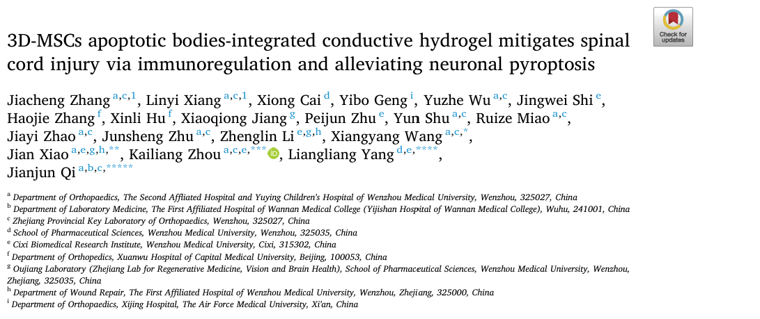The study, titled "3D-MSCs apoptotic body-integrated conductive hydrogel reduces SCI via immunoregulation and neuronal pyroptosis alleviation," was published in Bioactive Materials.