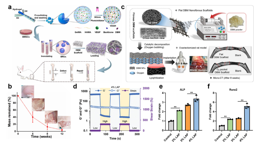 DBM-based absorbable materials for orthopedic applications. (a) Schematic diagram of repairing large-scale bone defects by combining a decalcified bone matrix framework with a photo-crosslinked osteogenic microgel bone regeneration system. (b) In vivo degradation assessment of VDGH microgels in the subcutaneous environment of nude mice. Reproduced with permission [190]. Copyright 2022, Elsevier. (c) Schematic diagram of electrospun DBM composite scaffold preparation and bone repair process. Reproduced with permission [191]. Copyright 2024, Elsevier. (d) Step-strain measurement of G-HA/4%LAP to characterize the self-healing ability of G-HA/LAP hydrogel. (e,f) Expression of osteogenic gene markers ALP and Runx2 evaluated on day 7 using qRT-PCR. Reproduced with permission [192]. Copyright 2024, Wiley-VCH. It has good biocompatibility and biodegradability, and contains abundant chemical sites, which are conducive to functionalization [131, 132].