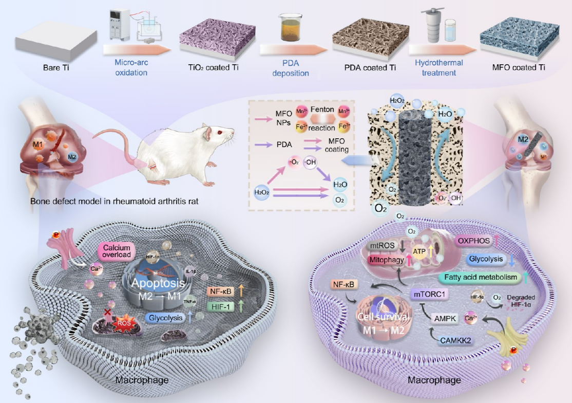 传统的钛 (Ti) 基种植体通常无法在伴有类风湿性关节炎 (RA) 的骨缺损中实现骨整合,这主要是由于 RA 病理微环境,其特征是活性氧 (ROS) 水平升高和缺氧。这种微环境诱导线粒体功能障碍和细胞内 Ca2+ 过载,促进巨噬细胞向 M1 表型极化,从而损害骨免疫调节骨整合。为了应对这一挑战,在 Ti 上构建了一种纳米酶启发的涂层,其特点是将 MnFe2O4 纳米颗粒沉积到聚多巴胺(PDA)装饰的微孔 TiO2 表面上(称为 MFO 涂层)。评估了涂层在体外和体内伴有 RA 的骨免疫调节骨整合,并研究了潜在机制。由于将 H2O2 有效转化为 O2 和强大的 ROS 清除能力,该涂层减轻了病理微环境诱导的线粒体 ROS 积累和细胞内 Ca2+ 过载,同时提高了细胞内 O2 水平,从而防止巨噬细胞细胞凋亡。同时,通过改善微环境,涂层通过 Ca2+-AMPK-mTOR 信号通路激活中度线粒体自噬,促进功能失调线粒体的去除,并保持线粒体的动力学和完整性。 结果,恢复的线粒体将其代谢途径从依赖厌氧重新编程为依赖有氧氧化磷酸化,促进巨噬细胞向 M2 表型极化,这不仅抑制破骨细胞生成,而且加速 RA 大鼠的骨整合。该涂层为钛基种植体设计提供了一种变革性的方法,用于治疗与炎症性疾病相关的骨缺损,有可能降低翻修手术的风险,并为患者提供持久的使用寿命。