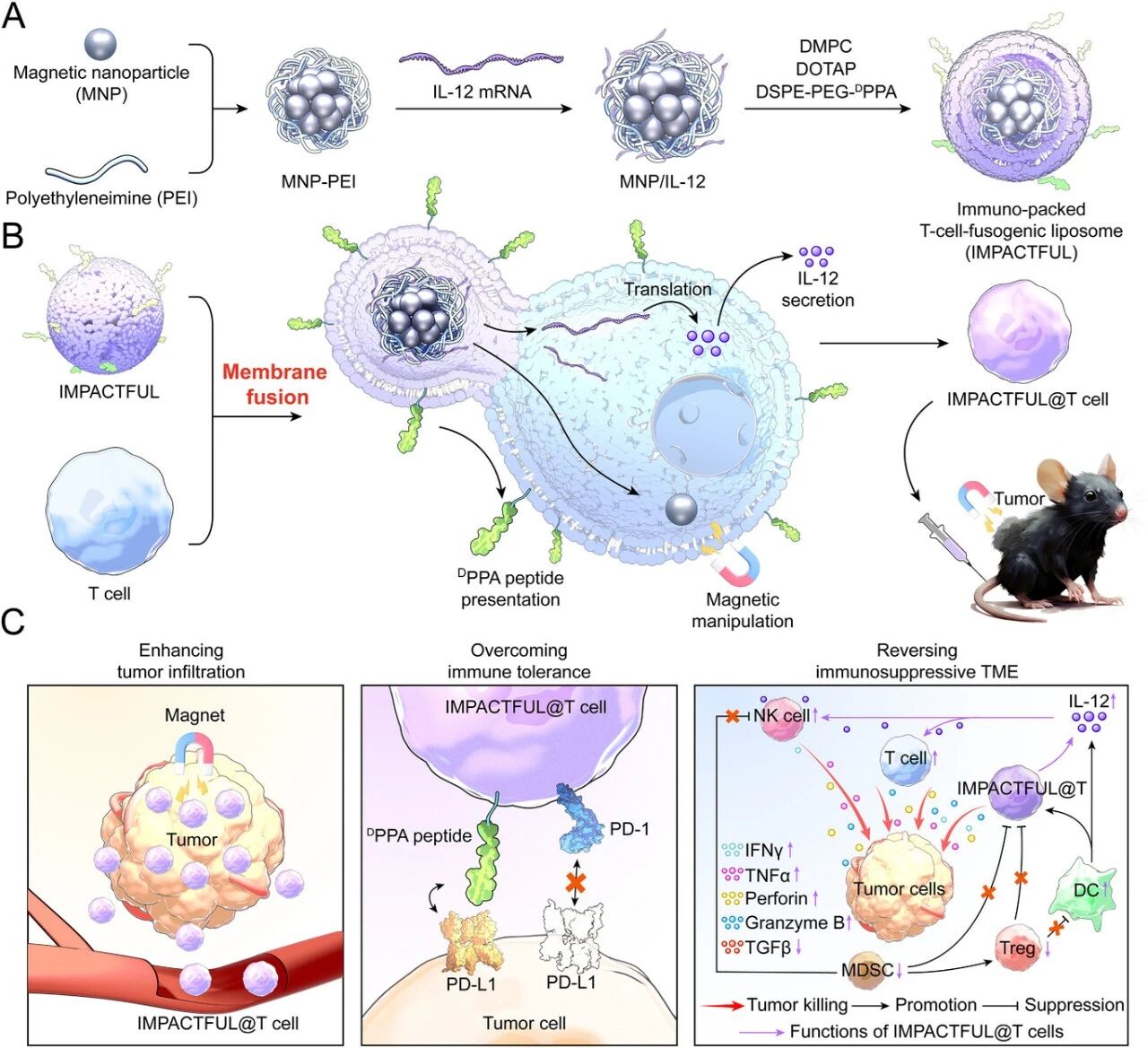基于免疫增强型T细胞融合脂质体(IMPACTFUL)的一步式T细胞工程策略用于实体瘤治疗过继性T细胞疗法在部分血液肿瘤治疗中取得了显著成功,但其对实体瘤的疗效仍受限于多种免疫学挑战,包括肿瘤浸润不足、肿瘤细胞的免疫耐受以及免疫抑制性肿瘤微环境(TME)。本文报道了一种一步式细胞工程策略,利用一种免疫增强型T细胞融合脂质体(简称IMPACTFUL)来增强T细胞对实体瘤的治疗效果。通过膜融合,IMPACTFUL 能够在T细胞表面修饰DPPA多肽,同时将负载白细胞介素-12 mRNA的磁性纳米颗粒核心(MNP/IL-12)递送至细胞质内。MNP/IL-12的内化使T细胞获得在外加磁场引导下的高效肿瘤靶向能力,并通过表达IL-12逆转免疫抑制性肿瘤微环境。而DPPA多肽的呈现使T细胞能够通过阻断PD-L1检查点来克服肿瘤细胞的免疫耐受。在小鼠实体瘤模型中,经IMPACTFUL工程化改造的T细胞能更有效地浸润肿瘤、抵抗耗竭,并诱导更倾向于炎症反应的肿瘤微环境,从而相较未修饰的T细胞显著抑制了肿瘤生长。综上,IMPACTFUL能够通过单步操作赋予T细胞多种互补功能,从而增强过继性T细胞疗法的效力。该方法为改善T细胞疗法治疗实体瘤的疗效提供了一个通用平台,并有望加速其向临床应用的转化。