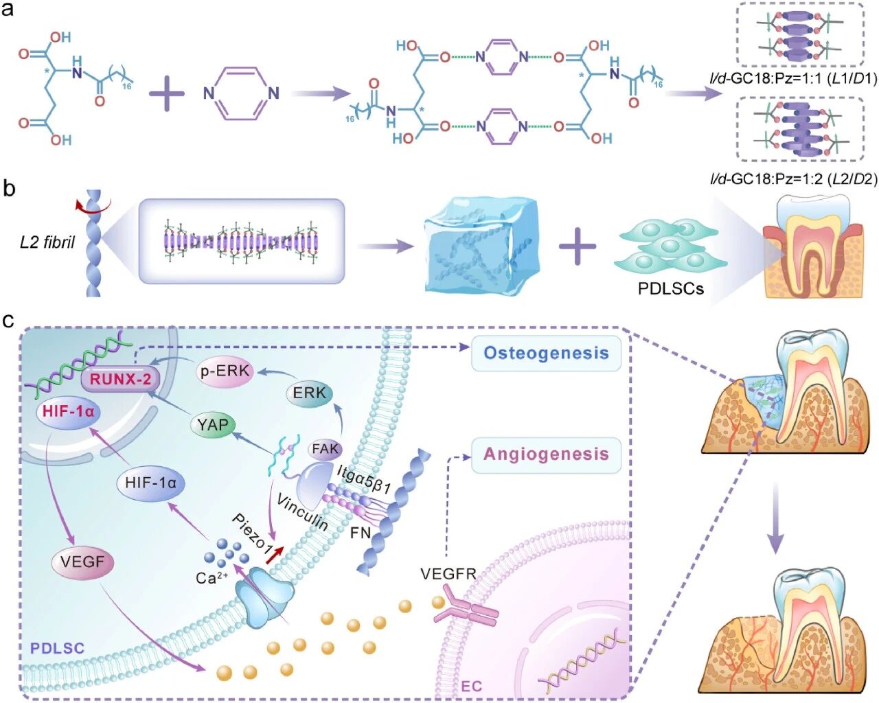 支持有效组织再生的两大支柱是多能干细胞与引导分化的基质材料。细胞外基质的手性作为影响干细胞命运的关键结构特征,其作用机制尚待深入探索。目前,关于分子手性或超分子螺旋性对牙周膜干细胞(PDLSCs)——这一安全且易获取的干细胞来源——分化的影响仍知之甚少。本研究通过手性氨基酸衍生物对映体(L/D-GC18)与桥联吡嗪分子的共组装构建了纤维结构。该纤维的螺旋性同时取决于氨基酸的分子手性及两组分的化学计量比。结果表明,分子手性与超分子螺旋性能协同作用:由L-GC18与吡嗪组装形成的左旋纤维在体内显著促进了PDLSCs的成骨分化。此外,手性纤维在小鼠颅骨及牙槽骨缺损模型中均有效促进了骨再生。值得注意的是,左旋纤维通过整合素依赖性途径诱导成骨分化,进而激活Piezo1介导的血管内皮生长因子(VEGF)驱动的血管生成。这些发现为基于PDLSCs的下一代再生治疗策略提供了理论蓝图。