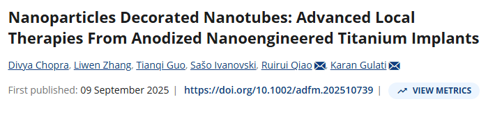 钛基牙科和骨科种植体在患者状况不良时面临长期成功挑战。通过 Ti 植入物表面修饰实现局部药物释放,是提升植入物临床成功的有吸引力的策略。在各种表面地形和化学改造中,电化学阳极氧化钛植入物与钛(TiO-2)纳米管或 TNT 可增强植入物-组织整合,并能直接在植入微环境中加载和洗脱强效治疗剂。基于 Ag、Au、Ga、Cu、Zn 等的纳米颗粒(NP)已被纳入 TNT/Ti 植入物中,以实现包括骨整合、免疫调节和杀菌疗效在内的协同疗法。然而,NP 装饰 TNT 的治疗与毒性平衡尚不充分,亟需进一步研究。在这项全面综述中,详细考察了掺入 TNTs 的 NPs 是否在不引发细胞毒性的情况下达到优越治疗潜力。综述强调了该领域的关键研究空白和未来方向,以确保此类新型可定制治疗植入物的临床可迁移性。