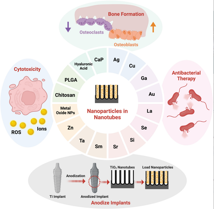 纳米管作为“仓库”,能实现纳米粒子的高负载与可控缓释,将治疗集中于植入界面,避免全身副作用。载银纳米管抗菌性强,载钙磷纳米管促进骨再生,载镓或锶则能协同抗感染与促整合。
