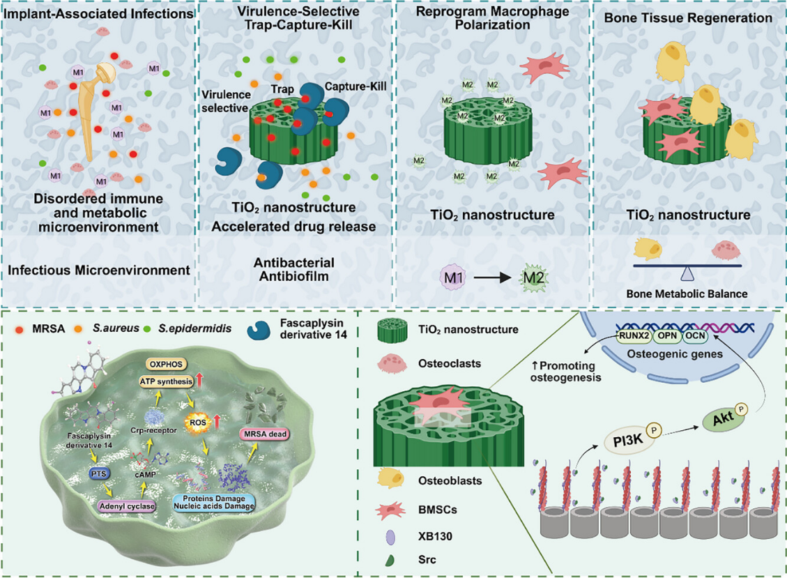 近期,一项发表于《先进科学》的研究带来了一种全新的解决方案。科研团队巧妙设计了一种基于二氧化钛纳米管阵列的智能抗菌系统,并将其命名为F-14-TNA。这个系统并非简单粗暴地“滥杀无辜”,而是精心策划了一场针对高毒力细菌的“精准围剿”,其核心策略可概括为“诱捕-捕获-杀灭”三部曲。