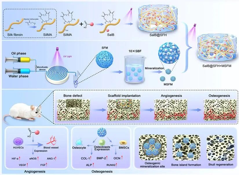 支架采用了功能模块化的设计思路。载有丹酚酸B的水凝胶模块主要负责早期招募内皮细胞、促进血管形成;而矿化水凝胶微球模块则模拟骨基质的微环境,为骨髓间充质干细胞的粘附、增殖和成骨分化提供晚期信号和力学支撑。两个模块协同作用,共同确保了再生微环境的有序演替 。