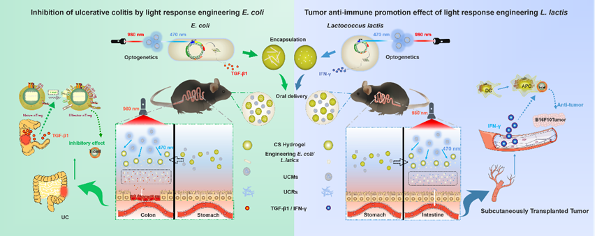 This work not only opens up a new way for optogenetics, but also expands a new model for the application of genetically engineered microorganisms in vivo biomedical engineering for the effective treatment of immune disorders. The first author of this paper is Yang Chun, Cui Meihui and Zhang Yingying from the School of Life; corresponding author is Wang Hanjie from the School of Life and Sun Tao from the School of Chemical Engineering/Biosafsafety Center.