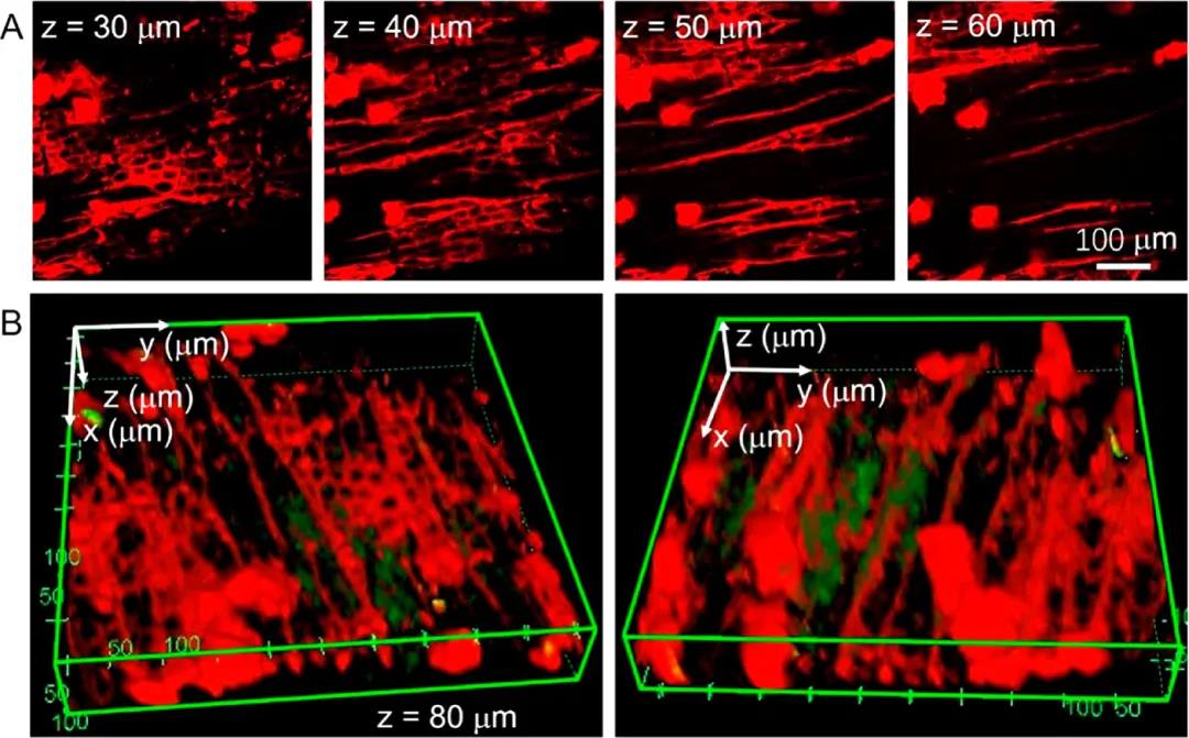 1) On mouse melanoma models, AIE-NPs can be used as imaging agents for spatiotemporal imaging of tumor tissues, with a penetration depth of up to 505μm. NIR-1 (800 nm) two-photon fluorescence imaging showed that AIE NPs accumulated in the tumor tissues of the mouse melanoma model, especially the tumor blood vessels.