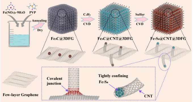 1. The three-dimensional graphene/carbon nanotube confined Pyrrhotite Fe7S8 hierarchical structure covalently connected by chemical foaming and CVD strategies, in which the porous structure of the three-dimensional graphene (3DFG) can grow confined carbon nanotubes (CNT) Avoid agglomeration, and carbon nanotubes can further confine Pyrrhotite Fe7S8 nanoparticles to buffer volume expansion while avoiding particle agglomeration. In addition, the CNT@3DFG covalent structure can serve as a three-dimensional conductive network to promote electronic and ion conduction.
