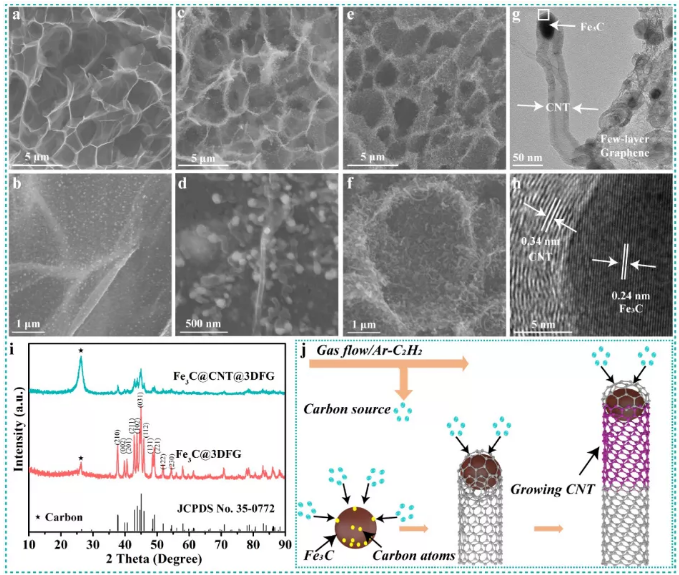 Figure 2. Process study of Fe3C catalyzed CNT growth. (Ab) SEM image of Fe3C @3DFG, (cd) Fe3C @3DFG SEM image of 5min CNT growth, (ef) Fe3C @CNT@3DFG SEM image (growth 15min CNT), (gh) Fe3C @CNT@3DFG TEM and HRTEM images, (i) XRD comparison before and after CNT growth, (j) Schematic diagram of the process of Fe3C catalyzed CNT growth.