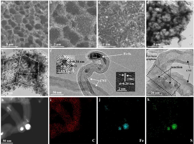 Figure 3. The morphology characterization of Fe7S8@CNT@3DFG. (A-c) SEM images. (D-e) TEM image, (f-g) HRTEM image. (H-k) HAADF-STEM images and element mappings.