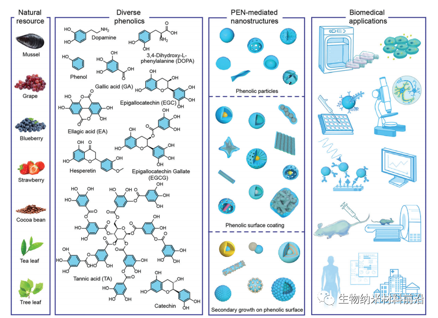 Development of PEN for biomedical applications. From left to right: representative natural resources of phenols, chemical structure of representative phenolic molecules, some typical PEN-mediated particle diagrams, and potential applications in biomedical fields, including biomedical nanointeraction research, biosensors, imaging and disease therapy, from single molecular and cellular levels to animal and clinical trials.
