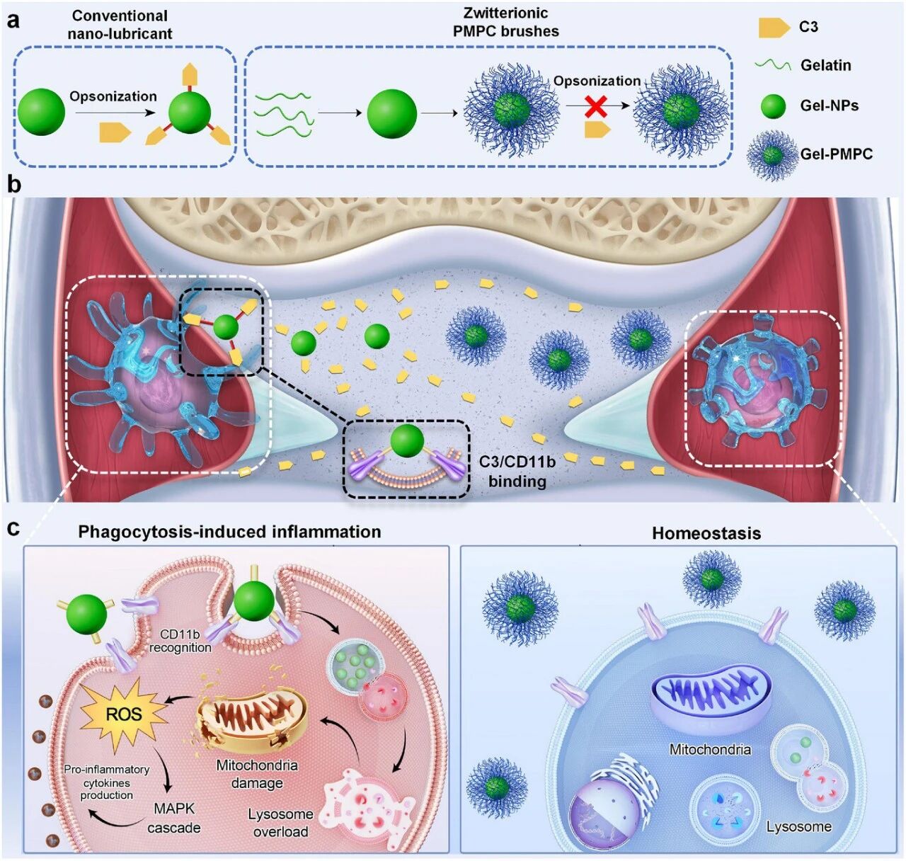 The use of biolubricants is a promising treatment for osteoarthritis (OA), especially if they can both control symptoms and halt disease progression. However, the clearance of these biolubricants mediated by synovial macrophages can lead to reduced therapeutic efficiency and adverse inflammatory responses. Here, it is shown that this process is primarily mediated by the specific binding of complement C3 (on nanoparticles) and CD11b (on macrophages). More importantly, through a systematic evaluation of various interface modifications,A macrophage-evading nanoparticle strategy was proposed, which not only minimizes friction but also largely suppresses the adsorption of C3. It involves using a zwitterionic poly(2-methacryloyloxyethyl phosphorylcholine) (PMPC) brush layer grafted from a crosslinked gelatin core. In vitro studies have shown that this nanoparticle lubricant can evade macrophage phagocytosis and further prevent pro-inflammatory M1 polarization and the subsequent harmful release of cytokines. In vivo studies indicate thatThe PMPC-coated layer designed in this study can effectively reduce synovial inflammation, alleviate OA-related pain, and protect cartilage from degeneration, thereby preventing OA progression. These findings clarify the key role of complement C3-mediated macrophage recognition in nanoparticle clearance and provide a promising nanoparticle design strategy for restoring joint lubrication.