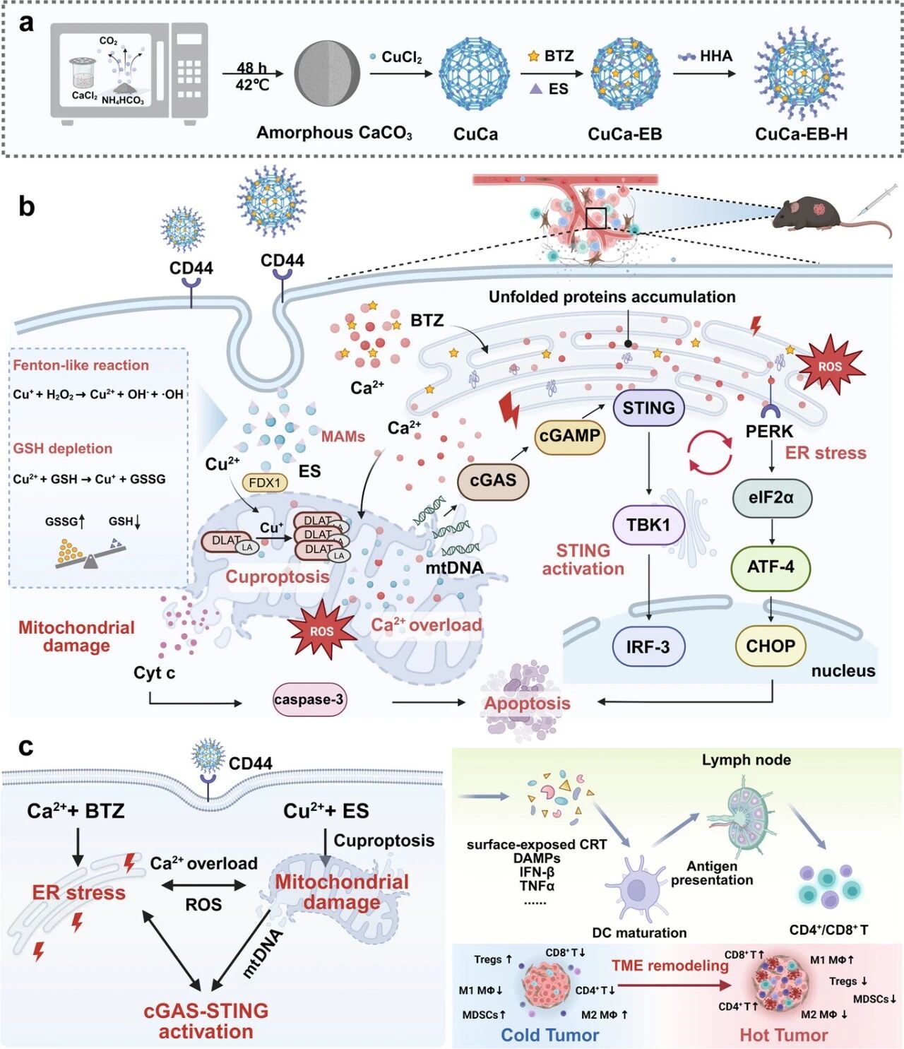 Disruption of ion homeostasis offers potential for antitumor immunity, but its therapeutic effects remain unsatisfactory due to difficulties in achieving robust immunogenicity and unclear molecular mechanisms. This study introduces a tumor-targeted cage-like nanomedicine (CuCa-EB-H), a copper-calcium bimetallic nanocage loaded with proteasome inhibitor bortezomib (BTZ) / copper ion complex elesclomol (ES) and decorated with hyaluronic acid, aiming to unlock the mechanisms that regulate endoplasmic reticulum (ER) stress and mitochondrial dysfunction to induce antitumor immunity.Specifically, BTZ and exogenous Ca²⁺ overload can trigger endoplasmic reticulum (ER) stress, which not only induces the translocation of ER ferritin to the cell surface but also causes a massive release of endogenous Ca²⁺ that is transmitted to the mitochondria, thereby exacerbating mitochondrial Ca²⁺ overload. At the same time, ES mediates the targeted delivery and accumulation of Cu²⁺ in mitochondria, inducing tubular deformation of copper, further aggravating mitochondrial damage and promoting mitochondrial DNA release, thereby activating the cGAS–STING pathway, resulting in ER stress-mediated antitumor immunity.In addition, the effects of copper ions work synergistically with these processes, amplifying the release of damage-associated molecular patterns and demonstrating robust immunogenic effects. The CuCa-EB-H nanomedicine collectively establishes a mutually reinforcing cascade of endoplasmic reticulum stress–mitochondrial dysfunction–STING activation, significantly stimulating dendritic cell maturation, increasing effector T cell infiltration, and reversing the immunosuppressive tumor microenvironment. This study provides mechanistic insights into ion-interference immunotherapy and offers a promising strategy to enhance immune checkpoint therapy.