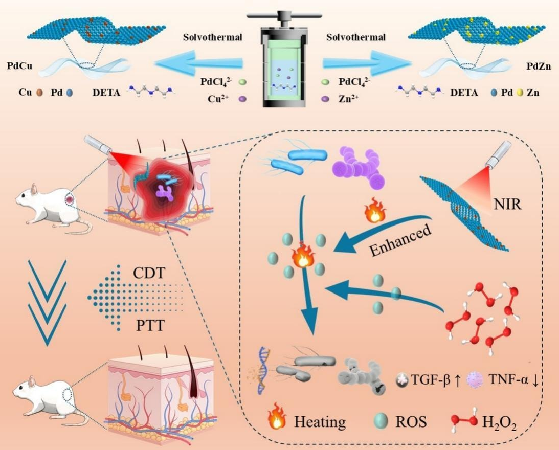 The misuse of antibiotics has exacerbated the problem of bacterial resistance, making antibiotic treatments ineffective and, in severe cases, even life-threatening. Therefore, novel antibacterial materials and their clinical applications have attracted significant attention from healthcare professionals. Bimetallic nanozymes hold great potential in treating clinical bacterial infections due to their excellent antibacterial activity and good biocompatibility. In this study, PdZn and PdCu bimetallic nanozymes with folded structures were synthesized via a one-step hydrothermal method. Their photothermal and peroxidase-like catalytic activities were compared, and computational studies were conducted to analyze the reasons for the differences in their catalytic performance.In addition, the antibacterial efficacy and wound healing potential of these two nanozymes were also evaluated. Experimental results showed that PdCu exhibited superior catalytic performance compared to PdZn, which is consistent with density functional theory calculations confirming its enhanced catalytic capability. In vitro antibacterial experiments successfully demonstrated that PdZn and PdCu can effectively inhibit the survival of Escherichia coli and Staphylococcus aureus to below 2% through the synergistic effect of photothermal catalysis using a 980 nm near-infrared laser. In vivo antibacterial experiments showed thatPdZn and PdCu nanozymes can promote wound healing and alleviate inflammatory responses. Compared with PdZn, PdCu shows superior ability in promoting wound healing. PdCu H2O2 NIR and PdZn H2O2 NIR reduce the wound area to 9.37% and 6.04%, respectively, while the control group only decreases to 41.21%. Overall, this study further explores the potential of Pd-based nanozymes in biological applications and provides guidance for the synthesis of efficient Pd-based two-dimensional nanobiomaterials.