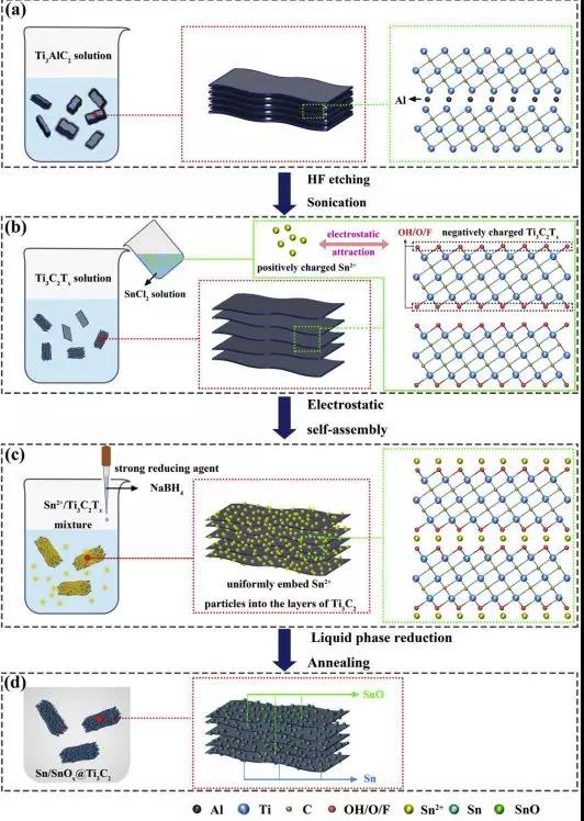 In this study, Sn/SnOx nanoparticles were grown in situ between MXene nanosheets by simple electrostatic adsorption and liquid phase reduction. The synergistic effect of the two methods greatly improved the conductivity, structural stability and ions in the electrochemical reaction. The spread of the two combines the advantages of both. On the one hand, MXene nanosheets, as a conductive skeleton, accelerate the transfer of electrons and ions while preventing the aggregation and volume expansion of Sn/SnOx nanoparticles. On the other hand, Sn/SnOx nanoparticles can effectively reduce the heavy accumulation of MXene nanosheets during the insertion and extraction of lithium ions. The composite electrode has ultra-high rate performance and cycle performance, and is the most potential anode material for next-generation lithium-ion batteries.