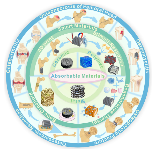 Bone defect repair remains a major clinical challenge because autografts are limited by donor availability, and biologically inert implants usually require secondary surgery. Absorbable materials, including polymers, ceramics, and metals, are rapidly transforming orthopedic care by providing temporary support and synchronous degradation to match tissue regeneration. This review focuses on the cutting-edge advances in composite scaffolds, which enhance mechanical integrity, degradation kinetics, and osteoinductivity.We further explored innovative systems integrating stimulus-responsive smart materials (such as photothermal and piezoelectric materials), 4D-printed smart materials, regenerative therapies, and bone organoids. Emerging clinical data are discussed in the context of diseases such as osteonecrosis, osteomyelitis, and osteoporosis. Looking ahead, we propose transformative directions including artificial intelligence-driven scaffold design, gradient architectures, and immunomodulatory strategies to address the spatiotemporal mismatch between degradation and regeneration. This review provides a forward-looking framework for next-generation multifunctional, bioresponsive orthopedic implants.