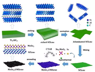 Figure 1. Schematic of the synthesis of single-layer MXene and MoSe2 / MXene heterojunctions