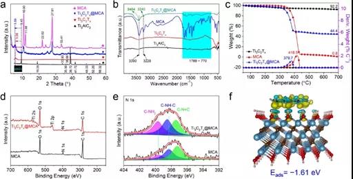 Figure 2. (a) XRD patterns of Ti3AlC2, Ti3C2TX, MCA and Ti3C2TX@MCA; (b) FTIR patterns; (c) TGA curve under nitrogen; (d) XPS graph; (e) MCA and Ti3C2Tx@MCA high N 1S XPS image at resolution; (f) Side view of the structure of a single-layer Ti3C2TX nanosheet loaded with MCA.