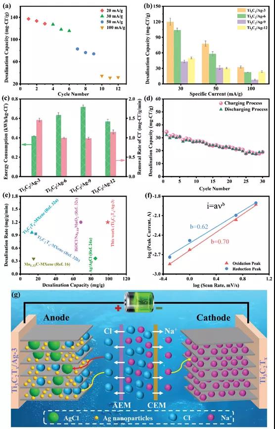 本文所制备的Ti3C2Tx/Ag复合物具有亲水性并且电荷转移电阻较低。Ti3C2Tx/Ag-3电极表现出了优异的倍率性能(在50 mA g-1的电流密度下,1.5 mg Cl-g-1 min-1),高脱盐容量(0.01 M NaCl溶液中,在20 mA g-1的电流密度下达到135 mg Cl-g-1),良好的循环稳定性以及低能量消耗。因此,研究者们推断,优异的脱盐性能来自于电池行为的Ag纳米线与赝电容行为的层状Ti3C2Tx材料的协同效应。MXene不仅作为一种插层电极,还可以作为一种简易的电子导电网络来支持Ag/AgCl的转化反应。