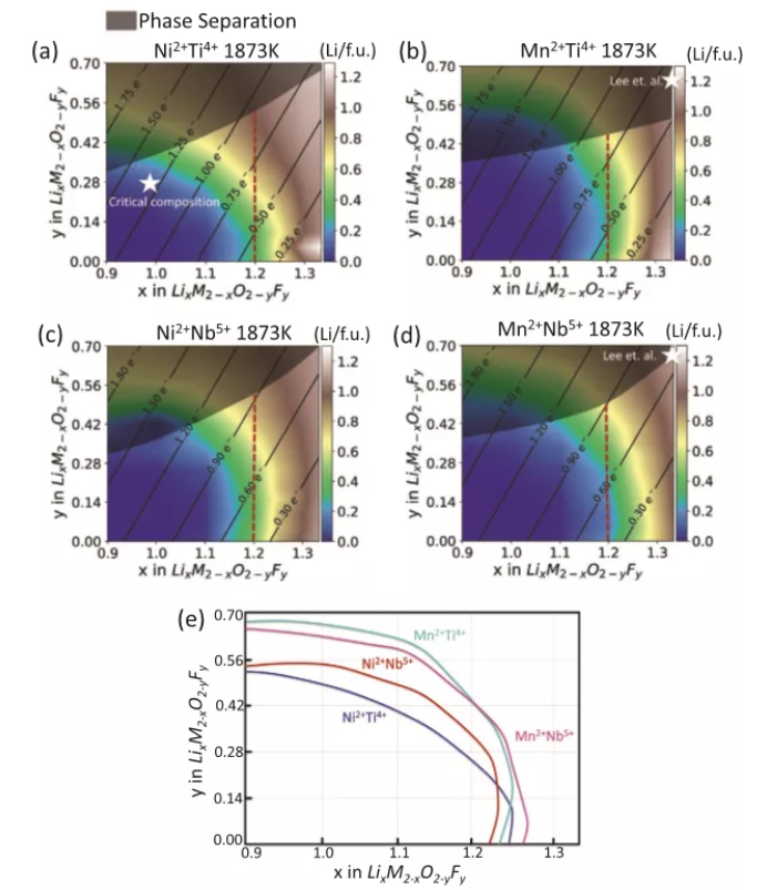 无序岩盐(DRX)锂离子电池正极材料具有高能量密度,而且不依赖有限矿产资源。氟掺杂是提高其循环寿命和能量密度的关键促成因素。由于Li-F的强相互作用,F预计也会改善材料中短程阳离子有序,对Li离子传输很重要。Ceder教授(通讯作者)课题组结合密度泛函理论和蒙特卡罗模拟计算研究了DRX材料中Li-F短程有序对Li渗滤和扩散的影响。模拟结果显示F掺杂常常在足够高浓度时有益,甚至能促成无Li过量化合物中的渗滤,使其能够结合更多的过渡金属氧化还原容量,更高的能量密度。当F含量小于15%时,其作用是有益还是有害依赖于无氟氧化物中固有的短程有序结构。采用大量仿真能够得到一个显示过渡金属容量、Li传输和合成可实现性间权衡的图谱。