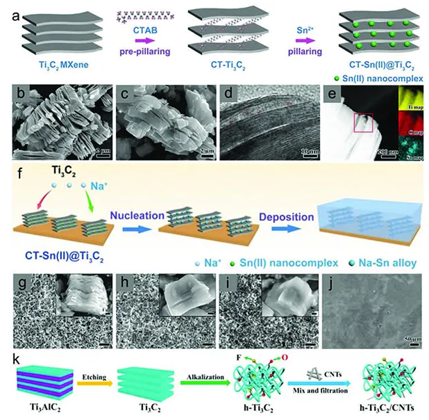 (f)Na在CT-Sn(II)@Ti3C2集流体中的成核和沉积行为;