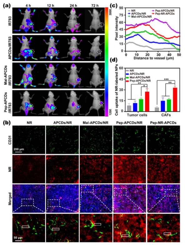 (1)实验将阿霉素(DOX)和免疫治疗增强剂(Fe离子)固定在CDs表面,并将肿瘤微环境调节剂(氯沙坦,LOS)包裹在其中孔内。研究表明,负载药物的该纳米组装体能够响应CAFs以裂解成单个CDs,进而释放LOS以缓解间质形成和乏氧环境。