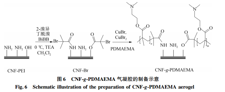 聚合物接枝是通过共价键的形式将长链聚合物或低聚物接枝到纳米纤维素表面,不仅可使纳米纤维素疏水化改性,同时还能使纳米纤维素获得针对性的功能化改性,且热稳定性得到很好的提高。在纳米纤维素上接枝聚合物侧链不仅可以改善其疏水性,还可以在聚合物-纳米纤维素相界面上形成大量的物理缠结,并且在目标聚合物中有一定的相容性。Zhou等将聚己内酯二醇接枝到纳米纤维素上,得到的疏水复合材料保持了纳米纤维素的尺寸结构,同时由于其在氯仿中分散性好而在水中聚集并漂浮在水面上,可见其疏水性能有所提高;与此同时,热稳定性也得到了显著提升。Li等通过将 CNF与环氧丙氧基丙基三甲氧基硅烷(GPTMS)和支化聚(乙烯亚胺)(b-PEI)交联制备得到柔性CNF气凝胶。随后利用α-溴异丁酰溴(BiBB)作为引发剂将其引入GPTMS和b-PEI修饰的CNF气凝胶表面(CNF-PEI),以使 BiBB改性的CNF气凝胶(CNF-Br)的表面可以成功聚合接枝N,N-二甲基氨基-2-甲基丙烯酸甲酯聚合物(PDMAEMA),制备了可控制表面润湿性的纳米纤维素气凝胶(如图6所示)。接枝后的气凝胶表面呈现一定的疏水性,接触角最高达到130°;并且在 CO2存在下气凝胶表面可从改性后的疏水性变为原本的亲水性,实现了气凝胶表面润湿的可逆性。