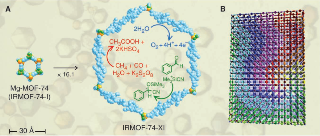 金属有机骨架(MOF)结构适合在其内部扩展和合并多个官能团。(A)MOF的等网状扩展通过使用有机链接器的扩展版本来保持网络的拓扑结构。(B)多元MOF(MTV-MOF)的概念图,其孔由按特定顺序排列的功能异质混合物装饰。