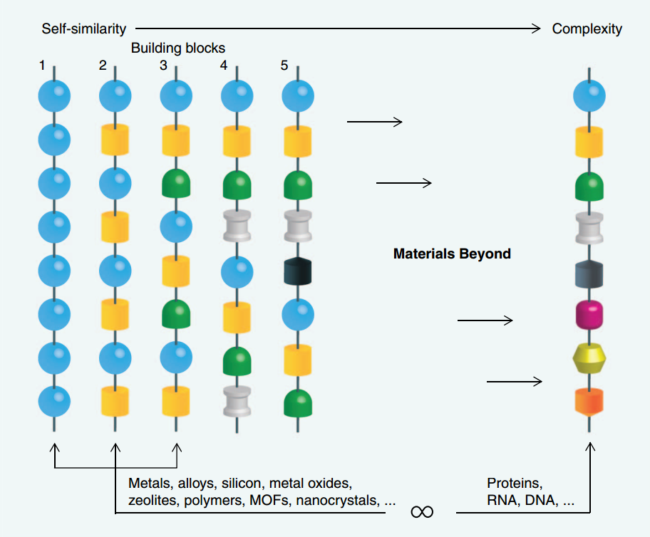这些用途广泛的材料(金属,合金,硅,金属氧化物,沸石和聚合物)是由几种类型的结构单元(一到三种)构成的,以制造自相似(图左侧)的材料,其中此类结构单元会在整个材料中定期重复。而在生物结构(蛋白质,RNA和DNA)中发现的具有三个以上构建单元的合成晶体的例子很少。所以,以MOF的构造为例,通过牢固的网状化学键将结构单元连接起来,对于开发“超出范围的材料”的结构(例如DNA)和功能空间很有用。
