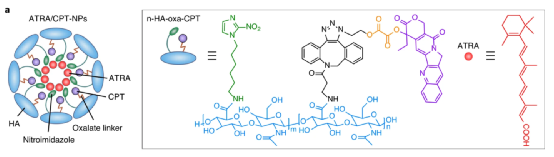研究人员选择ATRA和CPT分别作为模型诱导分化和细胞毒性药物。通过顺序性药物释放,从而把协同效应最大化。即,首先需要从纳米载体中释放ATRA,以诱导CSC分化为非CSC,其干性和化学抗性降低,这增加了CSCs对随后释放的CPT的敏感性,并阻止了CPT作用下对干细胞的上调。于此,研究人员合成了一种聚合物-药物共轭物,即硝基咪唑改性的透明质酸-草酸酯-CPT共轭物(n-HA-oxa-CPT),可以组装成纳米颗粒并物理封装ATRA以获取ATRA / CPT-NP。