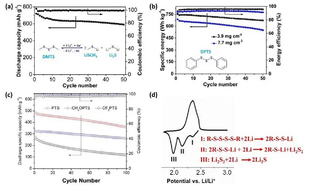 许多研究表明,有机二硫化物聚合后可以有效地抑制循环过程中硫损失。主链型和侧链型两种类型有机二硫聚合物相比,前者在放电过程中还原为硫离子,放电产物可溶于大多数有机电解液。有机二硫化合物虽然具有较高的理论容量,但实际容量仍较低。基于多个S-S键的有机硫化合物是由Naoi等人首次提出,以增加电池的能量密度。