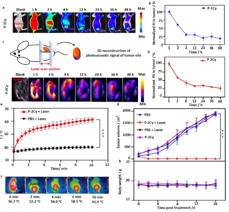 (1)肽主干在进入细胞后会被caspase-3/7裂解。随后,具有双花青素取代基团(Pr-2Cy)的自组装残基会排列形成P螺旋柱,其中的花青素染料的H-聚集体的光热转换效率是游离染料的3.4倍。